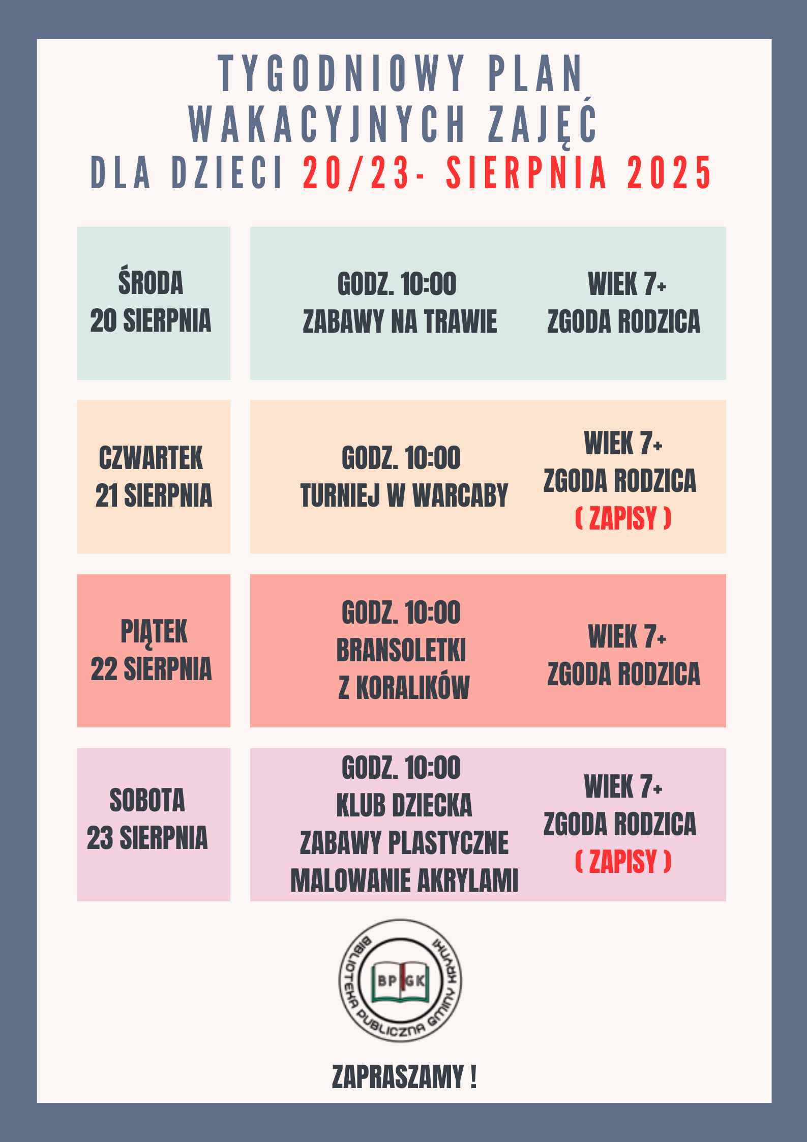 W najbliższym tygodniu zapraszamy dzieci na następujące zajęcia wakacyjne: