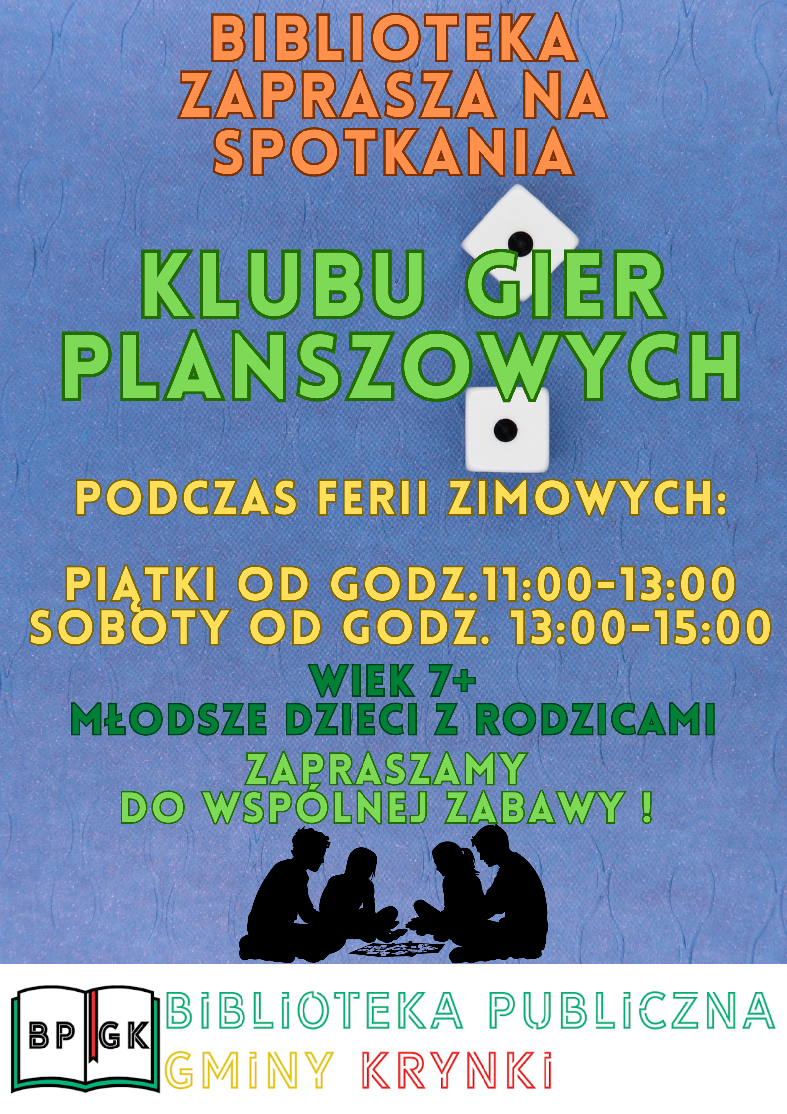 Podczas ferii zapraszamy dzieci i dorosłych na spotkania Klubu Gier w każdy piątek od godz. 11:00 do 13:00 oraz w każdą sobotę od godz. 13:00 do 15:00 !