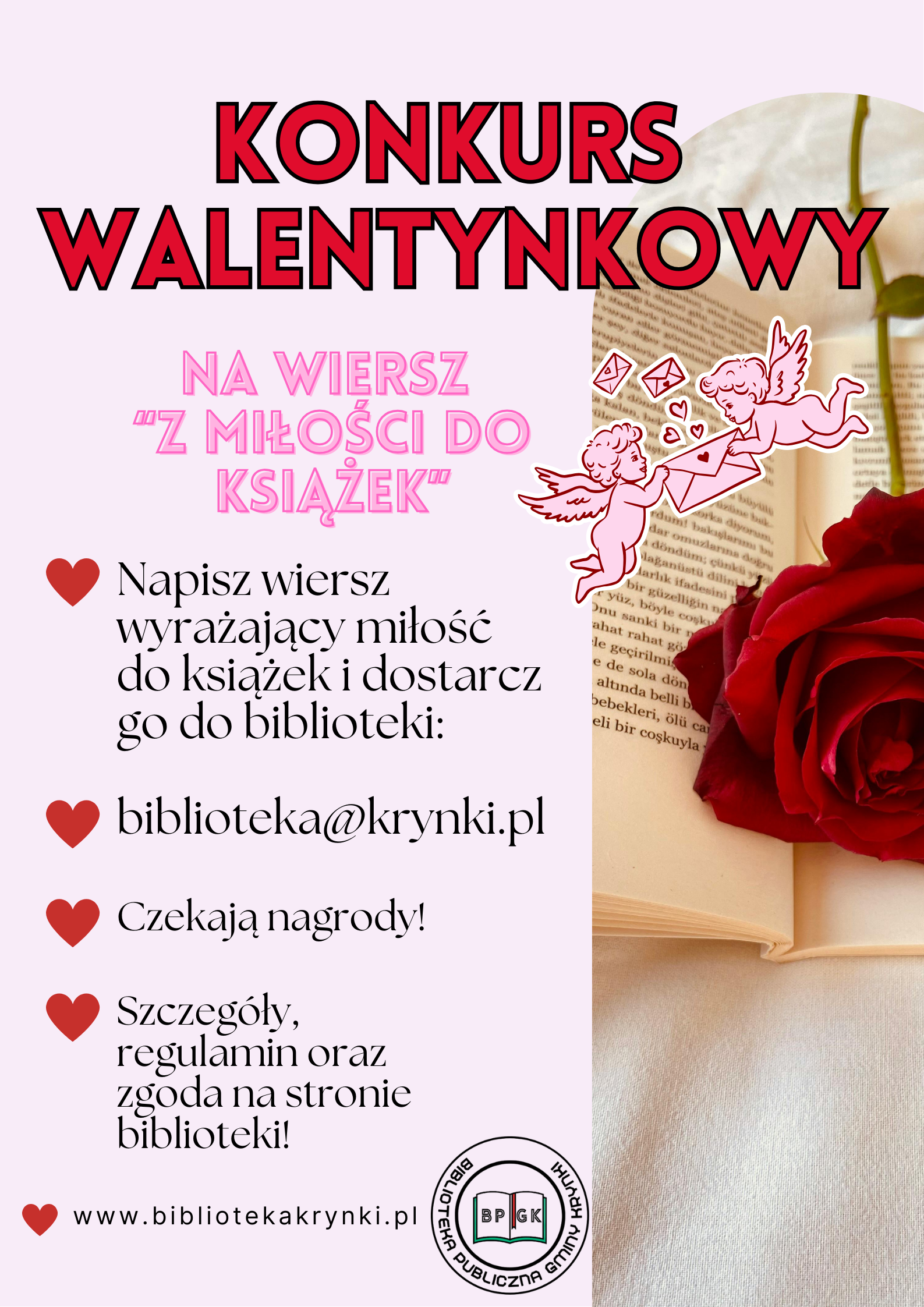 Uwaga ! Ogłaszamy konkurs walentynkowy na wiersz który wyrażać będzie miłość do książek oraz czytania.