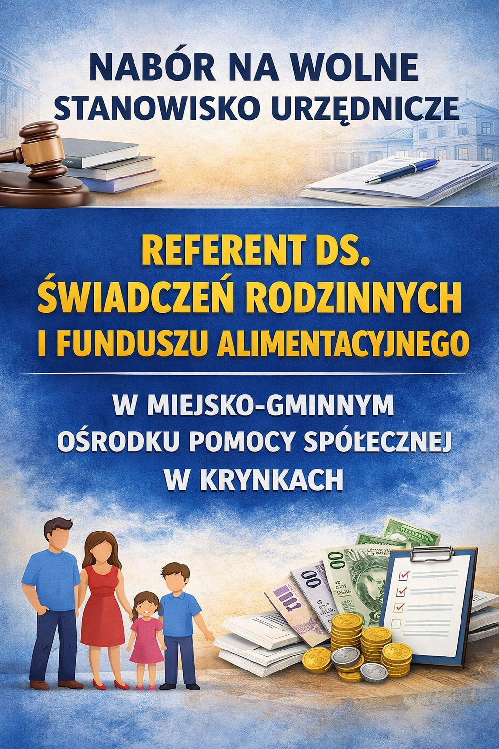 Miejsko-Gminny Ośrodek Pomocy Społecznej w Krynkach informuje, iż prowadzi nabór kandydatów na wolne stanowisko urzędnicze – referent ds. świadczeń rodzinnych i funduszu alimentacyjnego.